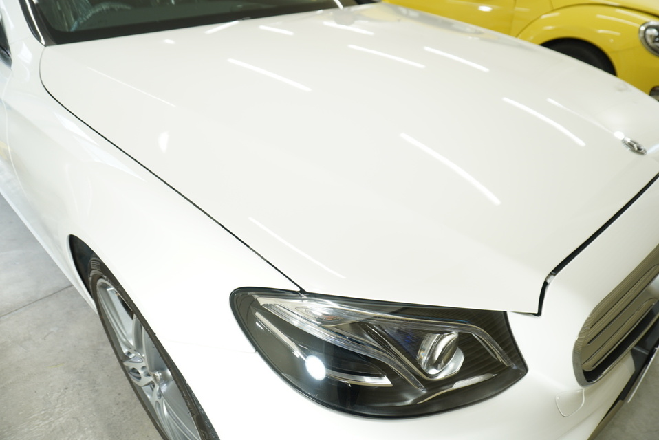 ベンツE220d(ホワイト)にエシュロンNANO-FIL施工|透明感と極上の艶を実現